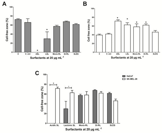 To evaluate the effects of glycolipids on in vitro cell migration in both HaCaT and SK-MEL-28 cells, a scratch was made vertically across a monolayer of each cell line. Cells were then treated with each glycolipid preparation at 20 µg mL−1 (a concentration previously shown not to affect the viability of each cell line). Following 24 h of treatment, we examined the closure of the artificial wounds by measuring the area of the cell-free zones. HaCaT cell treated with both sophorolipid preparations showed a significant decrease in the cell-free zone after 24 h (lactonic SL p ≤ 0.01; acidic SL p ≤ 0.001). No significant decrease in cell free zones was observed for HaCaT cells treated with both rhamnolipid preparations and SLES (Figure 4a). SK-MEL-28 cells showed a significant increase in the cell-free zone when treated with all four glycolipid preparations (p ≤ 0.05), with no significant difference observed in cells treated with SLES (Figure 4b). When directly comparing both cell lines treated with the glycolipid preparations, we observed both lactonic and acidic sophorolipids to significantly inhibit the migration of SK-MEL-28 cells compared to HaCaT cells treated under the same conditions (lactonic SL p ≤ 0.01; acidic SL p ≤ 0.001) (Figure 4c). Treatment with both rhamnolipid preparations and SLES showed no significant difference between each cell line with regards to cellular migration (Figure 4c). The most profound effect was with acidic sophorolipids, where the percentage of cell free space in the scratch following 24 h incubation was 71.42% for SK-MEL-28 compared with 0.01% for HaCaT. Moreover, there was no change in cell morphology upon examination, indicating the results from scratch assays were not dependent on a decrease in cell viability at the treatment concentrations used (data not shown).