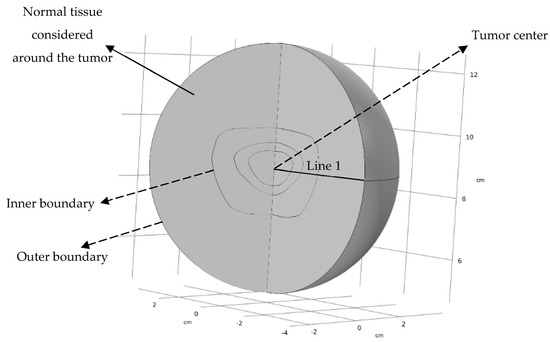 Figure 1 shows the cross-sectional view of the real tumor studied in this research. Different parts of the tumor are illustrated in this figure. Due to the availability of one image of the tumor and the approximate symmetry of the cross-sectional view, half of this view is drawn, and the computational domain is considered axisymmetric. Figure 2 shows the computational geometry around which normal tissue is considered. Line 1, shown in Figure 2, is used to draw IFP, IFV, and concentration profiles along it.