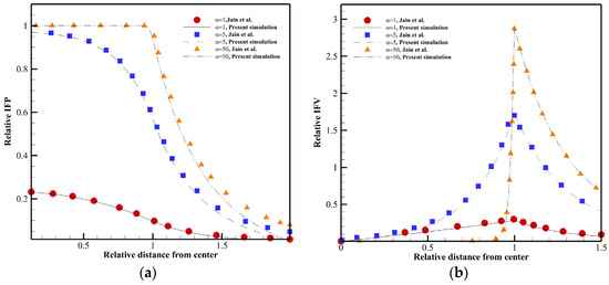 Comparison between the result of the present model and literature [40]. A tumor (R = 0.4 cm) embedded in the normal tissue is studied in this figure. (a) Distribution of the relative IFP. (b) Distribution of the relative IFV.