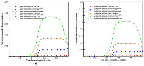 Comparison between the result of the present model and literature [19]. A tumor (R = 1 cm) with a 0.5 ratio of the necrotic radius to the tumor radius is investigated in this figure. (a) Interstitial concentration with bolus injection. (b) Interstitial concentration with continuous injection.