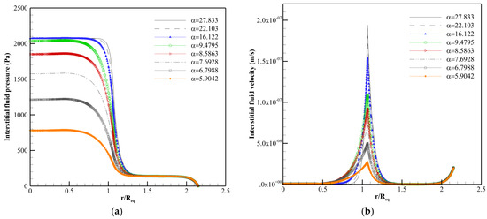 Areas where there is a pressure gradient and subsequently non-zero IFV shift to the inner parts of the tumor tissue by decreasing from 27.833 to 9.4795. A further decrease in cannot cause convective flow in the more internal areas of the tumor. However, the number of changes of IFP and IFV in the range of is more severe. It means that the effectiveness of normalization depends on the properties of the baseline parameters. As shown in Figure 8b, the value of IFV is low in areas other than the boundary, which indicates the small effect of convection in these zones.