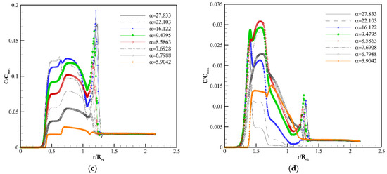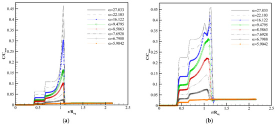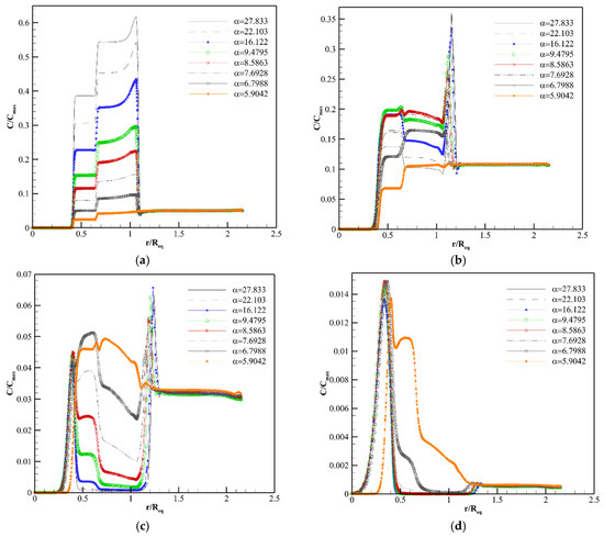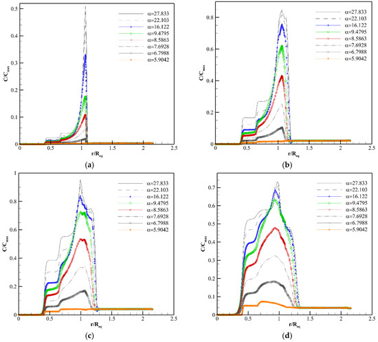 The concentration of increases slowly due to its transport properties (lower and and higher and in comparison to and ). Accordingly, normalization does not have a significant effect on improving the distribution up to 72 h post-injection (Figure 11a–d). However, the influence of normalization is shown in longer times. For example, Figure S1 shows the concentration distribution 12.5 days post-injection. As seen, the concentration distribution of at , , , and is better than that of the untreated tumor (). In fact, studies should be performed in a convenient time frame to decide about the normalization efficacy and desired normalization intensity, according to the specific characteristics of each drug and tumor size. In addition to what is said about normalization performance in improving distribution in Figure 9, trans-vascular convection is improved by normalization and contributes to a better distribution as the number is non-zero for , especially in the well-vascularized region. Nevertheless, trans-vascular diffusion is dominant in distribution in the original size according to the number in the interstitium far from the boundary.