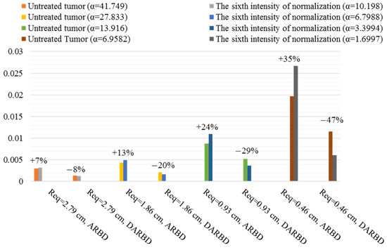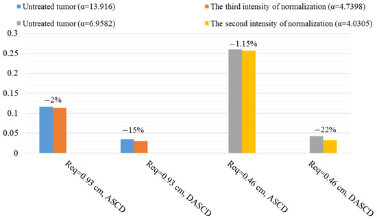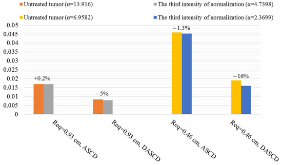 ASCD and DASCD of different macromolecules in different sizes of tumor and various normalization intensities are found. ASCDNE and DASCDNE in the duration of the final third are examined to study the average reservoir behavior distribution (ARBD) and its deviation (DARBD). The following figures show the best normalization intensities in improving the average behavior of macromolecule delivery in different tumor sizes.