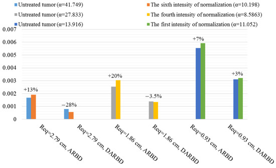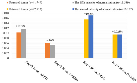 Figure 12 shows the ARBD and DARBD of in the untreated tumor and the normalized one with an intensity that causes the highest antibody exposure amount and lowest non-uniformity, i.e., the sixth of seven normalization intensities in different sizes. The smaller the tumor size, the greater the increase in ARBD and the greater the decrease in DARBD. The percentage of changes is illustrated in Figure 12. It is found that trans-vascular diffusion has a significant effect on the transport mechanism in all sizes by calculating the number. Modifying the diffusion from or into the blood vessels due to the normalization improves ARBD and DARBD. Intensifying normalization causes amelioration in reservoir behavior. However, normalization does not have a positive effect if the interstitium properties are similar to the normal tissue.