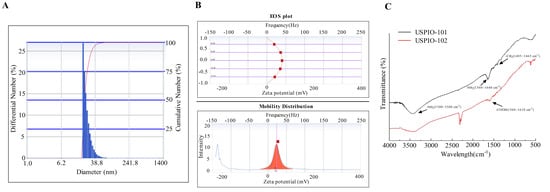 The dynamic light scattering (DLS), zeta potential analysis, and Fourier transform infrared spectroscopy (FTIR) spectra of ultrasmall magnetic iron oxide nanoparticles. (A) number distribution of USPIO-101, as measured by DLS. The concentration of USPIO-101 was 1 mg/mL. (B) Zeta potential analysis of USPIO-101. (C) Fourier transform infrared (FTIR) spectra are presented for USPIO-101 (black) and USPIO-102 (red), respectively. The -NH2 and -CH2 group signals are expressed in USPIO-101 at the wavelength of 3300~3500 cm−1, 1560~1640 cm−1, or 1405~1465 cm−1 (arrow). The -COOH group signal is expressed in USPIO-102 at the wavelength of 1550~1610 cm−1 (arrow).