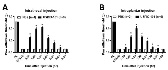 The analgesic effect of USPIO-101 was measured in mice with chronic inflammatory pain via different administration routes, intrathecal or intraplantar injection. After paw injection of CFA for four days, the mice showed decreased paw withdrawal thresholds. Both intrathecal (Figure 2A, PBS: 0.28 ± 0.02, USPIO-101: 2.1 ± 0.16 at 1.5 h, p < 0.05, two-way ANOVA and Bonferroni’s multiple comparisons) and intraplantar (Figure 2B, PBS: 0.29 ± 0.0, USPIO-101: 2.0 ± 0.15 at 1.5 h, p < 0.05, two-way ANOVA and Bonferroni’s multiple comparisons) injection of USPIO-101 (10 mg/mL, 10 μL) attenuated paw withdrawal thresholds.