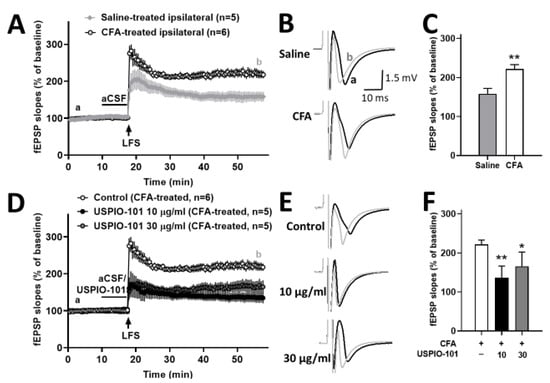 The effect of USPIO-101 on spinal cord LTP in CFA paw-injected mice. (A) Time courses of the slope of fEPSPs recorded before and after low-frequency stimulation (LFS, arrow) in spinal cord slices from CFA- or saline-treated mice. (C) The bar graph represents the magnitudes of potentiation, which averaged 20 fEPSPs recorded 30~40 min after LFS. **: p < 0.01 (unpaired t-tests) vs. CFA-treated ipsilateral group. (D) Time courses of the slope of fEPSPs recorded before and after LFS (arrow) in spinal cord slices from CFA-treated mice with USPIO-101 (10 or 30 µg/mL), respectively. USPIO-101 (10 or 30 µg/mL) applied for 7.5 min before LFS stimulation, respectively. (F) The bar graph represents the magnitudes of potentiation, which averaged 20 fEPSPs recorded 30~40 min after LFS at a concentration of 10 or 30 µg/mL. * or **: p < 0.05 or p < 0.01 vs. control group (one-way ANOVA). (B,E) Twenty recorded fEPSPs at time points a and b were averaged in each group. The slope of each fEPSP was expressed as % of the baseline fEPSP slope, which was the average of 20 fEPSPs at the beginning of 10 min recording. n indicates the number of slices recorded.