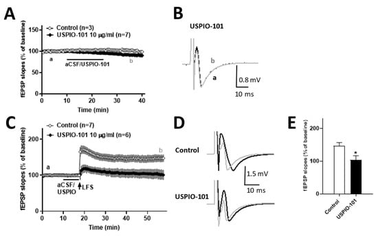 The effect of USPIO-101 on the hippocampal LTP is still unknown. Here, we investigated whether the hippocampal LTP at the Schaffer collateral-CA1 synapses was affected by USPIO-101 in naïve mice.