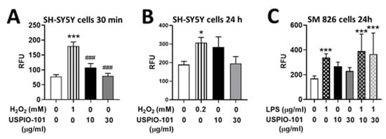 Intracellular reactive oxygen species level after treatment with USPIO-101 in SH-SY5Y or SM826 cells. (A,B) Hydrogen peroxide (H2O2) as positive control and USPIO-101 (10 or 30 μg/mL) were used in SH-SY5Y cells for 30 min (A, H2O2 1 mM) and 24 h (B, H2O2 0.2 mM), respectively. (C) Lipopolysaccharide (LPS) 1 μg/mL as positive control and USPIO-101 (10 or 30 μg/mL) were used in SM826 cells for 24 h, respectively. RFU means the relative fluorescence unit in 3 × 104 cells/well in 96-well plates. Data shown are the mean ± SEM of three independent experiments performed in triplicate. * or ***: p < 0.05 or p < 0.001 vs. control group. ###: p < 0.001 vs. the H2O2 group (one-way ANOVA).