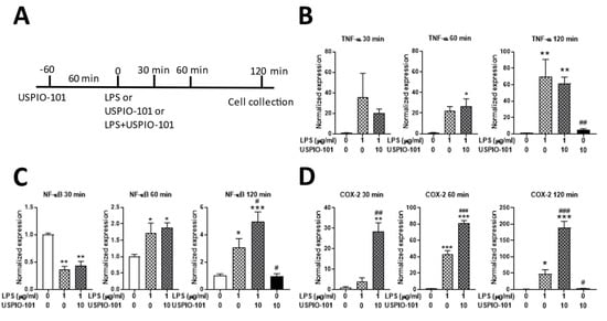 USPIO-101 potentiates the LPS-induced NF-kB and COX-2 mRNA expression in SM826 microglial cells. (A) The time scale for treating USPIO-101 and LPS stimulation. (B–D) The levels of mRNAs encoding the pro-inflammatory cytokines TNF-α (B), NF-κB (C), and COX-2 (D) were analyzed by qRT-PCR and normalized by the expression of GAPDH (glyceraldehyde-3-phosphate dehydrogenase) at three time points after LPS stimulation: 30, 60, or 120 min. Data are presented as mean ± SEM (n = 4). * or ** or ***: p < 0.05, or p < 0.01, or p < 0.001 vs. control; # or ## or ###: p < 0.05, or p < 0.01, or p < 0.001 vs. LPS.