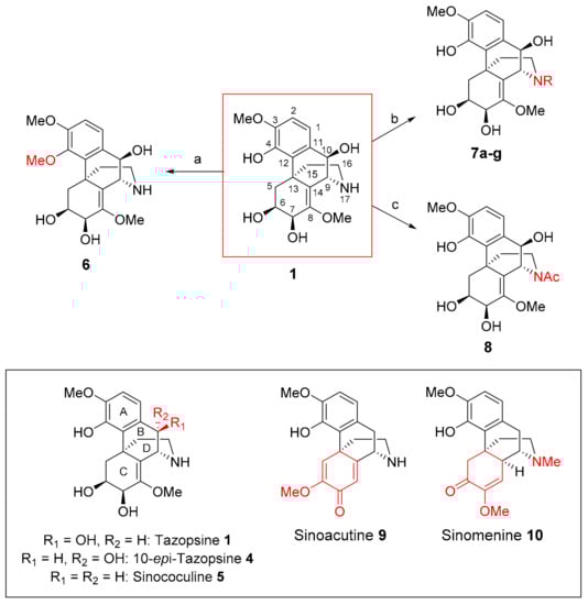 Semisynthetic access to tazopsine derivatives 6–8 and structure of natural ent-morphinan alkaloids for SAR generation (morphine numbering). (a) CH2N2, MeOH, 0 C, 12 h (39%); (b) aldehyde (1.1 eq), MeOH, r. t., 10 min then NaBH3CN (1 eq), r. t. (45–82%); (c) Ac2O (1 eq), MeOH, r. t., 1 h (45%). The box indicates the natural alkaloids.