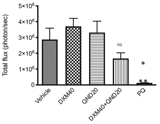 In vivo prophylactic activity of DXM 3 +/− QND compared to PQ in a mouse model of P. yoelii-Luc infection. Each group of mice consisted of five individuals. Results are shown as mean +/− SEM: Vehicle vs. DXM40 + QND20, p = 0.5171 (ns, not significative); Vehicle vs. PQ, p = 0.0124 (*); DXM40 vs. PQ and QND20 vs. PQ, p = 0.003 (**). ANOVA one-way test for multiple comparisons. Numeric values indicate doses in mg/kg.