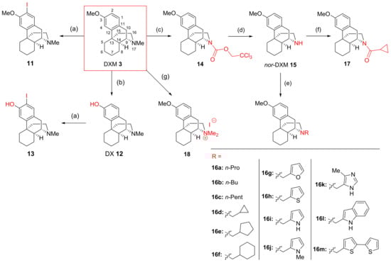 Semisynthetic access to DXM derivatives 11–18 for SAR generation (morphine numbering). (a) NIS (1.15 eq), p-TsOH (1.8 eq) (91% 11, 87% 13); (b) HBr 48%, reflux overnight (91%); (c) 2′,2′,2′-trichloroethylchloroformate (1.1 eq), toluene, reflux, 2 h (92%); (d) Zn powder (3 eq), AcOH, r. t., 1 h (47%); (e) aldehyde (1.1 eq), DMF, r. t., 10 min then STABH (2 eq), r. t. (33–97%); (f) cyclopropanecarbonyl chloride (1.1 eq), CH2Cl2, Et3N, 0 C to r. t, 1.5 h (75%); (g) MeI, rt, 2 h (82%).