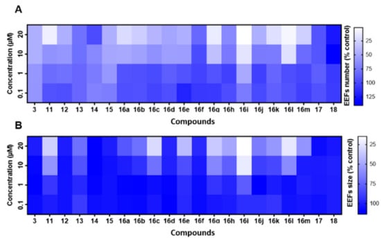 Normalized dose–response heatmap in PHH-Pb-GFP regarding EEF number (A) and EEF size (B) at 0.1, 1, 10, or 20 M of the indicated compounds. These results were obtained from four technical replicates.
