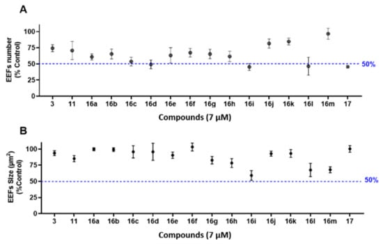 Normalized EEF number (A) and EEF size (B) in PHH-Pb-GFP at the arbitrary cut-off value of 7 μM for the indicated compounds. Each point (•) represents the average EEF number of four technical replicates. The error bars represent the interval of variability between EEF numbers. These results were obtained from four technical replicates.