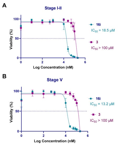 To explore the activity profile of the new hit cpd. 16i against other developmental stages of P. falciparum, we tested it against early (stages I–II) and late (stage V) gametocytes, the last being responsible for the transmission of P. falciparum malaria. Cpd. 16i was found to be fairly effective against both gametocyte stages, with activities in the high micromolar range (IC50 values of 18.5 M and 13.2 M, respectively), whereas DXM 3 was completely inactive (IC50 > 100 M) (Figure 7).