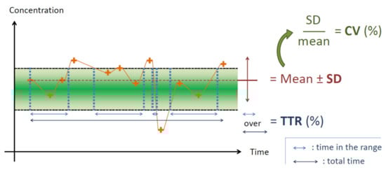 Overview of different calculation methods for IPV, highlighted in bold text. Orange crosses represent TAC concentrations, black dashed lines represent the therapeutic interval, light blue double arrows represent the time during which the patient is in the therapeutic interval assuming linear evolution of Cmin between occurrences, the dark blue double arrow represents the total measurement time. Cmin: whole blood tacrolimus trough concentration; CV: coefficient of variation; IPV: intra-patient variability; SD: standard deviation; TAC: tacrolimus; TTR: time in therapeutic range.