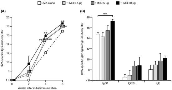 OVA-specific antibody production in combination with IMQ administration. C57BL/6 mice were immunized using the poke and patch method with OVA or OVA plus IMQ (0.5, 5, or 50 μg) three times every 2 weeks. (A) Sera collected every 2 weeks were assayed to determine OVA-specific total IgG titers by ELISA analysis. (B) Sera collected 2 weeks after the last immunization were assayed to determine IgG subclass titers and IgE titers by ELISA. The data shown are expressed as the mean ± SE of the results from four mice (Williams’ test, * p < 0.05, ** p < 0.01, versus OVA alone).