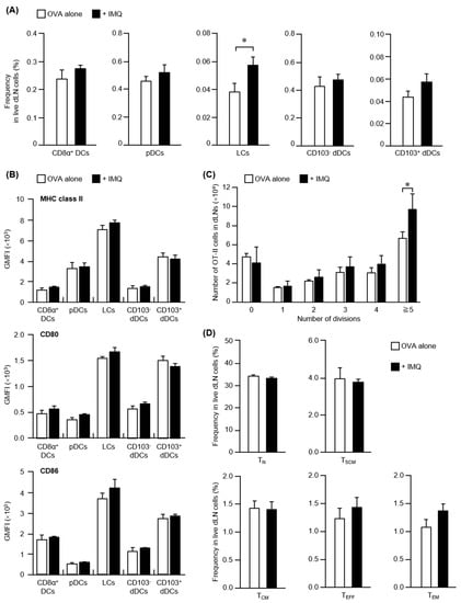 In this study, the number of LCs in dLNs increased, and the proliferation of antigen-specific Th cells was enhanced by the combined use of IMQ with transcutaneous immunization. However, we did not investigate the effect of the combined use of IMQ on the antigen-presentation efficiency of LCs. It is necessary to analyze the presentation efficiency or examine the possibility that LCs deliver antigens to other APC subsets. In addition, LC can cross-present with CD8+ T cells [], and we plan to investigate cell-mediated immunity induced by transcutaneous IMQ administration using transgenic mice that have Langerin- or CD11c-positive cells removed through diphtheria toxin.