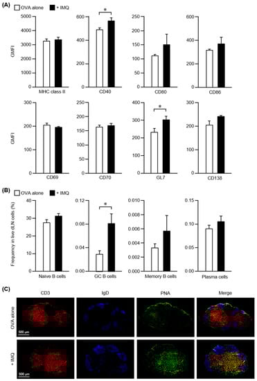 Although transcutaneous IMQ administration did not affect the direction of CD4+ T cell differentiation (Figure 2D), we speculated that IMQ may affect the activation state and differentiation of B cells. To investigate the effect of co-administering IMQ with OVA on B cell activation, we analyzed the expression intensity of B cell activation markers in dLNs at 2 weeks after the primary immune response. MHC class II is responsible for antigen presentation; CD40, CD80, and CD86 are co-stimulatory molecules; CD69 is an early activation marker []; CD70 contributes to IgG production []; GL7 is a GC B cell marker []; CD138 is a plasma cell marker []. When these expression intensities of these proteins were compared between the OVA-alone group and the IMQ-combination group, no significant differences were observed for MHC class II, CD80, CD86, CD69, CD70, and CD138, but the IMQ-combination group showed significantly higher expression of CD40 and GL7 (Figure 3A). These findings suggest that the combined use of IMQ enhanced B cell activation and differentiation into GC B cells.