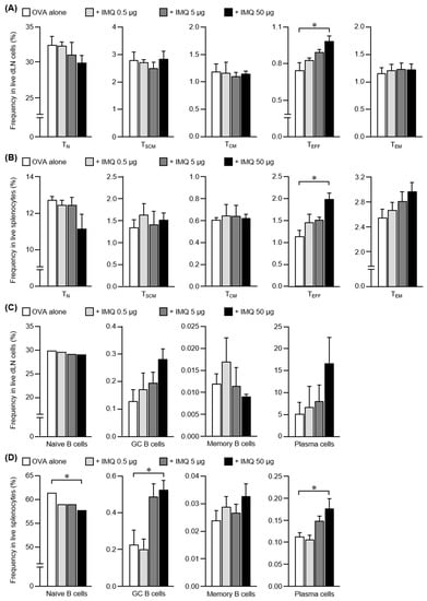 Differentiation of T cells and B cells after multiple immunizations with IMQ. C57BL/6 mice were immunized using the poke and patch method with OVA or OVA plus IMQ (0.5, 5, and 50 μg) three times every 2 weeks. Two weeks after the last immunization, CD4+ T cells were divided into five subsets: TN cells, TSCM cells, TCM, TEM, and TEFF cells. B cells were divided into four subsets: naive B cells, GC B cells, memory B cells, and plasma cells. The frequency of each population in the dLNs (A,C) or spleen (B,D) was analyzed by FCM. The data shown are expressed as the mean ± SE of the results from three to four (Williams’ test, * p < 0.05, versus OVA alone).