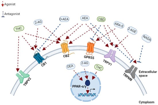 A schematic representation of the main components of the endocannabinoid system. Receptors, endogenous cannabinoids, and cannabis-based components. THC, tetrahydrocannabinol; CBD, cannabidiol; 2-AG, 2-arachidonoylglycerol; O-AEA, virodhamine; AEA, anandamide; ARA-S, N-arachidonoyl serine; 2-AGE, 2-arachidonoyl glycerol ether; NADA, N-arachidonoyl dopamine; TRPV2, transient receptor potential cation channel subfamily V member 2; CB1, cannabinoid receptor 1; CB2, cannabinoid receptor 2; GPR55, G protein-coupled receptor 55; TRPV1, transient receptor potential cation channel subfamily V member 1; TRPM8, transient receptor potential cation channel melastatin 8; PPAR-α, peroxisome proliferator-activated receptor-alpha; PPAR-γ, peroxisome proliferator-activated receptor-gamma.