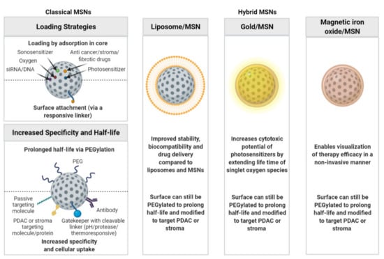 Diagram summarizing loading strategies of different molecules (siRNA/DNA, oxygen, sonosensitizer (e.g., IR780), anticancer drugs (e.g., gemcitabine, cisplatin, curcumin, irinotecan, paclitaxel, palbociclib, and oxaliplatin), anti-stroma drugs (e.g., TGF-β inhibitor), antifibrotic drugs (e.g., pirfenidone), photosensitizers (e.g., ZnPcOBP and methylene blue), methods to prolong half-life, increase specificity and cellular uptake (passive targeting molecules (e.g., polyethyleneimine), PDAC targeting molecules/proteins (e.g., folic acid, transferrin, urokinase plasminogen activator, V7 peptides, cyclosporine A, IGF1, c(RGDfE), and CCKBR aptamer), stroma targeting molecules (e.g., iRGD), gatekeeper with pH sensitive linkers (e.g., chitosan, disulfide bonds, and poly(D,L-lactide-co-glycolide) (PLGA)), gatekeepers with protease linkers (e.g., ADAM9-responsive linker capped with avidin, thermoresponsive gatekeeper (e.g., aliphatic azo group capped with β-cyclodextrin), antibodies (e.g., tMUC-antibody, GPC1-antibody, Cetuximab, anti-claudin 4, and anti-mesothelin), and hybrid MSNs.