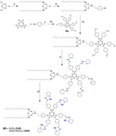 Synthesis of amphiphilic triazine-phosphorus metallodendrons. Conditions: (i) n-C12H25NH2, CHCl3, NaOH (aq.), 90%; (ii) tyramine, toluene, 110 °C, 95%; (iii) K2CO3, acetonitrile, 0 °C, 60%; (iv) AB5, K2CO3, acetonitrile, 75 °C, 93%; (v) 2-hydrazinopyridine, THF, 60 °C, 85%; (vi) CuCl2 or AuCl3, DMF, 60 °C, 54% or 40%.