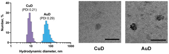 Particle size distribution in CuD and AuD solutions (left). TEM images of metallodendrons (right). Scale bar is 50 nm.