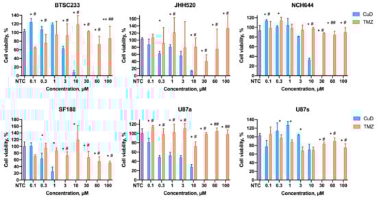 Profiles of the cell viability (MTT assay) after incubation with CuD metallodendrons and temozolomide (TMZ). NTC—non-treated control. Data are presented as mean ± S.D. * p < 0.05, ** p < 0.01 CuD vs. AuD; # p < 0.05, ## p < 0.01 CuD vs. TMZ.