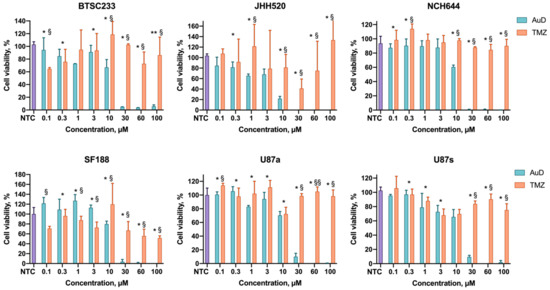 Profiles of the cell viability (MTT assay) after incubation with AuD metallodendrons and temozolomide (TMZ). NTC—non-treated control. Data are presented as mean ± S.D. * p < 0.05, ** p < 0.01 CuD vs. AuD; § p < 0.05, §§ p < 0.01 AuD vs. TMZ.