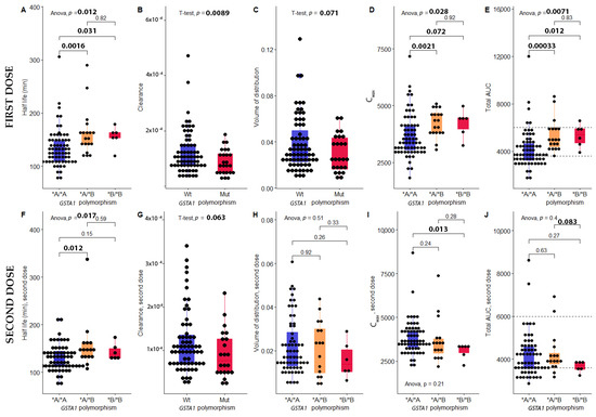 The impact of GSTA1 polymorphism on each PK parameter of Busulfan at fist dose (A): Half-life; (B): Clearance; (C): Volume of distribution; (D): Cmax; (E): Total AUC, and at second dose: (F): Half-life; (G): Clearance; (H): Volume of distribution; (I): Cmax; (J): Total AUC. GSTA1: Glutathione-S-tranferase; AUC: Area Under the Curve; Wt: Wild-type; Mut: Mutant; *A/*A: Homozygous wild-type; *A/*B: Heterozygous; *B/*B: Homozygous mutant. Anova: Compare more than 2 groups, 2 tails t-test: Compare 2 groups. Statistically significant threshold: 0.05.