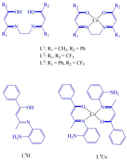 Gurley et al. reported that there are only a few studies describing Co-based metallodrugs with potential therapeutic applications [39]. For instance, Ott et al. informed the preparation and antitumor efficacy of [2-acetoxy-(2-propynyl)benzoate] hexacarbonyldicobalt [40]. Although the mechanism of action of this specie is unclear, it is suggested that it occurs via DNA–metal complex interaction [41]. Gurley et al. indicated their interest in using fluorinated ligands directly bound to a Co center. This is because fluorination can cause significant changes (physicochemical and biological) in the metallodrug. Hence, they designed at least two different types of ligands: (a) tetradentate bis(β-ketoaminato) (L1–L3) and (b) hydroxyimine (L4), Figure 3. It is noteworthy that L2 and L3 are fluorinated ligands. These ligands were coordinated to Co(II) metal centers to produce the corresponding complexes L1Co–L4Co.