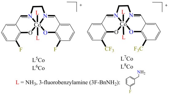 In this regard, the authors prepared a series of four Co(III) complexes, holding at the axial position molecules of NH3 or 3-fluorobenzylamine (3F-BnNH2) (Figure 4) (L5Co–L8Co). At the equatorial position, the metal center is coordinated to the ligands 3-fluorosalicylaldehyde ethylenediamine (3F-salen) or trifluoroacetylacetone ethylenediamine (tfacen). Here, the interest in the use of fluorinated ligands is mainly due to the following: (1) the study of the speciation in solution can be performed via 19F NMR, (2) the equatorial fluorinated ligands confer slow ligand substitution on the Co(III) center, and (3) these fluorinated compounds can be analyzed via 19F magnetic resonance imaging (MRI) or by 18F positron emission tomography.