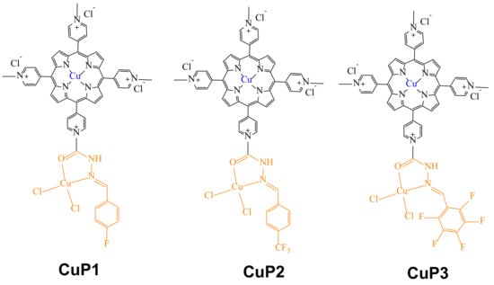 Copper is an essential trace element with fundamental function in many enzymes related to energy metabolism, mitochondrial respiration (e.g., cytochrome oxidase; Cco), antioxidation (e.g., Zn, Cu-super-oxide dismutase; SOD), collagen cross-linking (e.g., lysyl oxidase), pigmentation (e.g., tyrosinase), and cathecolamine biosynthesis (e.g., dopamine- β-monooxygenase) [46]. In part because of this, copper-based metallodrugs have attracted much attention for the treatment of tumor angiogenesis [47]. In fact, various copper-based complexes have been studied in vitro and in vivo. Studies have gathered a large volume of information indicating that the nature of the ligand plays an important role in the anticancer activity of copper complexes [48]. Hence, several ligands have been used for coordination to Cu(I/II) ions, including thiosemicarbazones, 8-hydroxylquinoline, imidazoles, pyridine N-Oxides, Schiff bases, hydrazones, and macrocyclic ligands [46,49]. However, most of these copper complexes have limited water solubility, making it difficult to find suitable medicinal applications for them. Thus, Li et al. engaged in the design of novel water-soluble acyl-hydrazone porphyrin Cu(II)-complexes (CuP1-CuP3) (Figure 6) [50], including fluorine on the acyl-hydrazone moieties and pyridinium fragments to improve their water solubility.