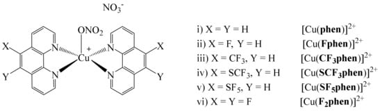 More recently, in 2021, Lüdtke et al. reported the preparation of a series of homoleptic Cu(II) complexes of the type [Cu(phen)2]2+ (phen = 1,10-phenanthroline) (Figure 7) [51], with 1,10-phenanthroline ligand being modified by incorporation of different fluorinated substituents.