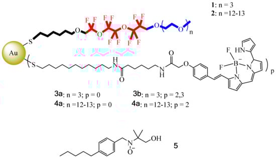 In addition, MRI experiments were performed using complexes 3 and 4 (40 mg·mL−1) under a 7 T magnetic field, first tested against HeLa cells in uptake and cytotoxic activity. Then, it was determined by UV experiments that 3a and 4a had a very low number of fluorescent dyes per NP (2.3). Additionally, 3b tended to agglomerate in aqueous solution because the lipophilic part was too short compared to the hydrophobic Bodipy region. To overcome this problem, 4b was prepared including 2 Bodipy units per NP. With the compound on hand, cellular uptake and cytotoxic activity studies were performed with 4b using buffered solutions, adding salts with the aim of enhancing its aqueous solubility, while in the case of 5, the ability of the monolayer to capture small organic probes was studied by electron spin resonance, with the results showing that 5 was inside the monolayer with the N-O group pointing to the fluorinated zone.