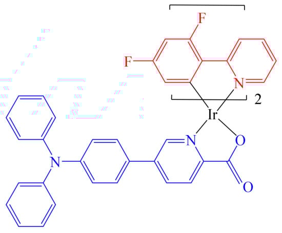 - Bai, D.; Chen, K.; Shi, H.; Peng, X.; Zhang, X.; Zheng, X.; Ren, H.; Qu, J. D-A type (dfppy)2Ir(pic-TPA) complex containing fluorinated pyridine-2-carboxylate ligand and triphenylamine: Synthesis, photophysics and bioactivity. Appl. Organomet. Chem. 2020, 34, e5320. [Google Scholar] [CrossRef]