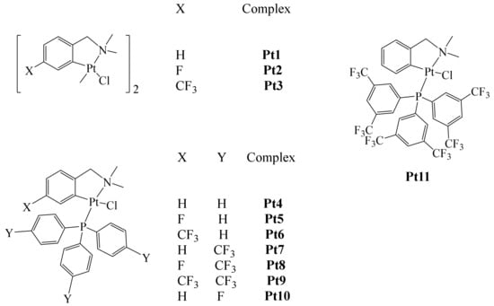 As mentioned above, despite their observed benefits as antitumor agents, Pt-based metallodrugs also exhibit several undesired side effects, which is the reason similar complexes have been synthesized. In this line, nonconventional C,N-cycloplatinated(II) phosphine antitumor complexes were prepared by Cutillas et al. (Figure 11) [60]. According to the authors, only complexes Pt4–Pt11 were evaluated in biological studies. Cytotoxic experiments were carried out towards T47D human breast cancer cell line and epithelial ovarian carcinoma cells A2780 and A2780cisR. Nonfluorinated complex Pt4 was used for comparison purposes. The results obtained showed complexes Pt7–Pt9 to exhibit the best cytotoxic effect in all tested cell lines. Complex Pt7 was particularly active against T47D, with an IC50 value 16 times smaller than that of cisplatin and 11 times smaller than that of the non-fluorinated analog [Pt(dmba)(PPh3)Cl] (dmba = dimethylaminomethyl-phenyl). Further, the Cisplatin resistance factor (RF) against A2780cisR (cisplatin-resistant ovarian carcinoma) was also determined, finding values of RF for complexes Pt4, Pt6, Pt8–Pt11 in the range of 0.5–1.0; for Pt7 only, a value above 2 was determined (an RF < 2 implies no cross resistance, indicating circumvention of cisplatin resistance).