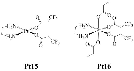 Here, complex Pt15 was synthesized starting from the complex dichlorido(ethane-1,2-diamine) platinum (II), to which two 3,3,3-trifluoropropanoate (tfpa) ligands were coordinated. Additionally, complex Pt16 was prepared by the oxidation of complex Pt15 with H2O2 and further treated with acetic anhydride.