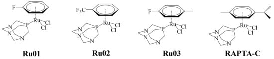 - Renfrew, A.K.; Phillips, A.D.; Tapavicza, E.; Scopelliti, R.; Rothlisberger, U.; Dyson, P.J. Tuning the efficacy of ruthenium(II)-arene (RAPTA) antitumor compounds with fluorinated arene ligands. Organometallics 2009, 28, 5061–5071. [Google Scholar] [CrossRef]
