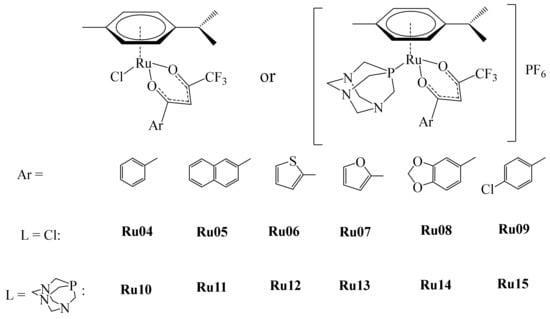 - Seršen, S.; Kljun, J.; Kryeziu, K.; Panchuk, R.; Alte, B.; Körner, W.; Heffeter, P.; Berger, W.; Turel, I. Structure-related mode-of-action differences of anticancer organoruthenium complexes with β-diketonates. J. Med. Chem. 2015, 58, 3984–3996. [Google Scholar] [CrossRef]