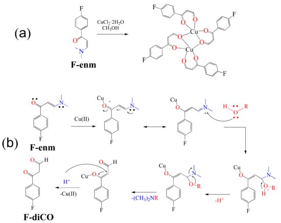 Additionally, El-Ghamry et al. in 2021 reported the formation of fluorinated enaminone Cu(II) complexes [53]. In this regard, the authors mentioned that ligands play an important role in the cytotoxic abilities of the metal complexes. They chose to use enaminone ligands, a chelating type of ligand that in the presence of Cd(II) has previously shown interesting anticancer activities [54]. Thus, the fluorinated enaminone ligand F-enm was reacted with CuCl2·2H2O, forming the unexpected dinuclear complex [Cu2(F-diCO)4] (Scheme 2a), a product of the transformation of the enaminone into the 1,3-dicarbonyl ligand F-diCO (Scheme 2b).