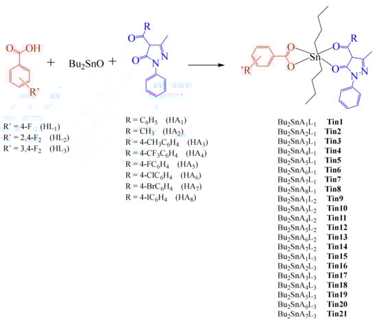 - Zhao, B.; Shang, X.; Xu, L.; Zhang, W.; Xiang, G. Novel mixed ligand di-n-butyltin(IV) complexes derived from acylpyrazolones and fluorinated benzoic acids: Synthesis, characterization, cytotoxicity and the induction of apoptosis in Hela cancer cells. Eur. J. Med. Chem. 2014, 76, 87–97. [Google Scholar] [CrossRef]