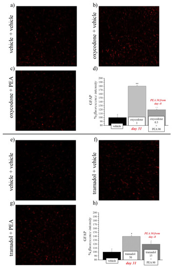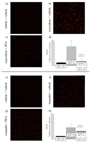 3.2. PEA Reduces the Astrocyte Activation Evoked by Opioids