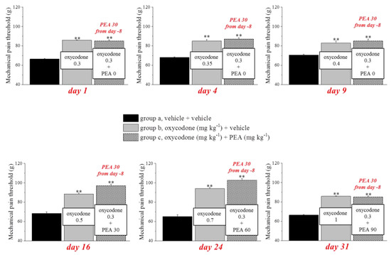- Group c: pre-emptive PEA (30 mg kg−1 from Day −8 to Day 31) + 0.3 mg kg−1 oxycodone (from Day 1 to Day 31) + increasing acute PEA (30–90 mg kg−1 from Day 16 to Day 31);