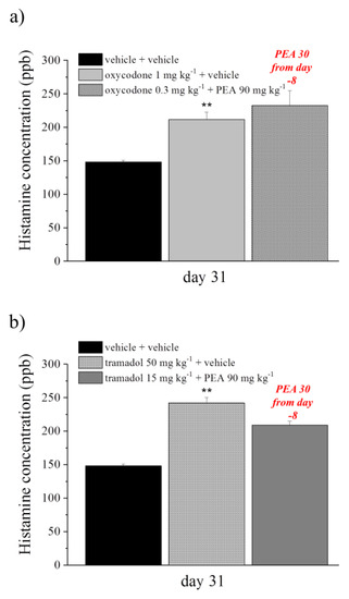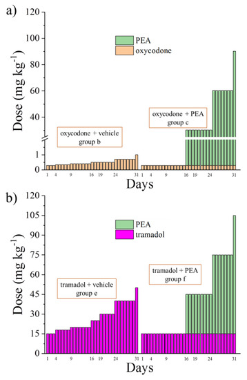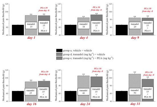 - Group e: pre-emptive PEA (30 mg kg−1 from Day −8 to Day 31) + 15 mg kg−1 tramadol (from Day 1 to Day 31) + increasing acute PEA (30–90 mg kg−1 from Day 16 to Day 31).