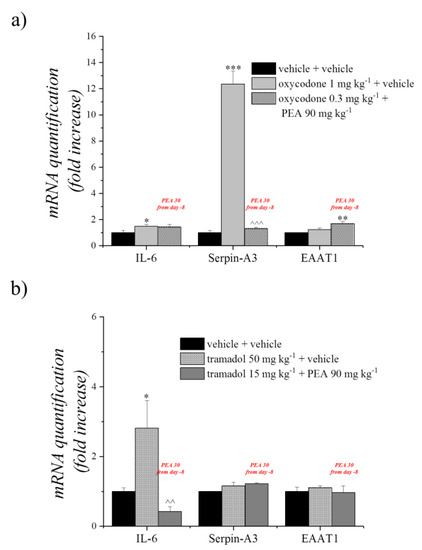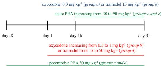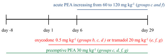 - Group d: pre-emptive PEA (30 mg kg−1 from Day −8 to Day 29) + 0.5 mg kg−1 oxycodone (from Day 1 to Day 29);