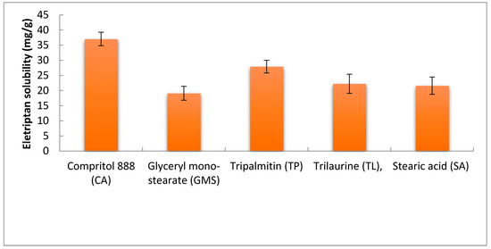 Eletriptan Hydrobromide (EH) solubility in different solid lipids namely: Compritol® 888 ATO (CA), Glyceryl mono-stearate (GMS), Tripalmitin (TP), Trilaurine (TL), and Stearic acid (SA) was assessed as follows.