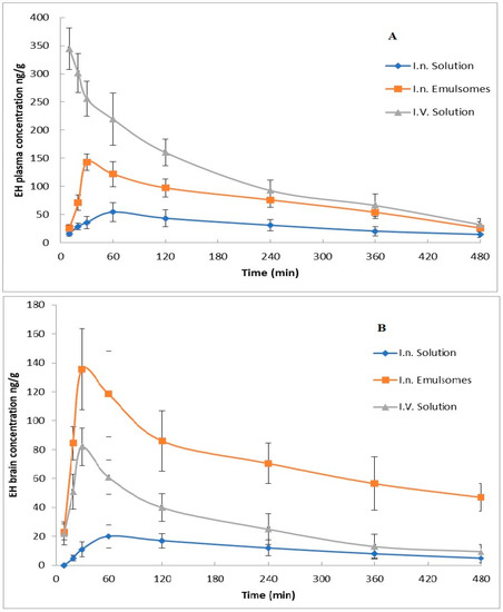 EH concentration in mice plasma and brain after administration of different treatments against time is shown in Figure 5, while its pharmacokinetic parameters, as well as DTE% and DTP%, are presented in Table 6. It was noticed that nasal administration of mucoadhesive EH-emulsomes formula has significantly higher Cmax and AUC(0–8) than i.v and i.n EH solution. The higher drug concentration in the brain after EH-emulsomes administration could be attributed to the nano vesicle size, which allows drug particles to be transported deeper into the olfactory epithelial cells layers [54] and translocated easily from one cerebral compartment to another [55]. The permeation enhancing effect of chitosan and the lipid structure of emulsomes increase the EH permeation affinity through the nasal membrane via the olfactory neurons in the olfactory bulb [55,56].